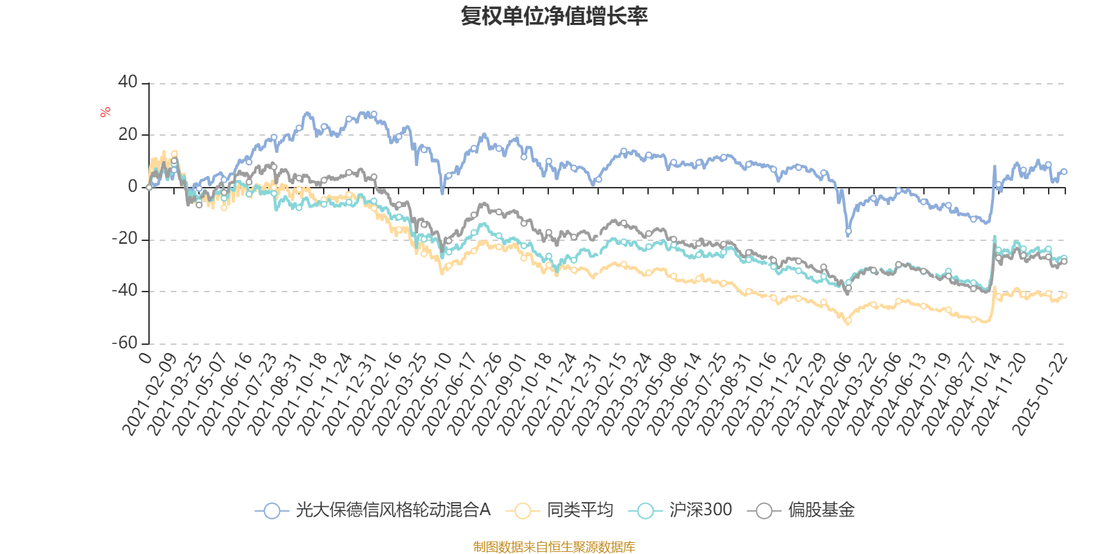 截至1月22日,光大保德信风格轮动混合A近三个月复权单位净值增长率为2.99%,位于同类可比基金99/536;近半年复权单位净值增长率为14.27%,位于同类可比基金160/536;近一年复权单位净值增长率为12.99%,位于同类可比基金270/500;近三年复权单位净值增长率为-13.17%,位于同类可比基金49/265。