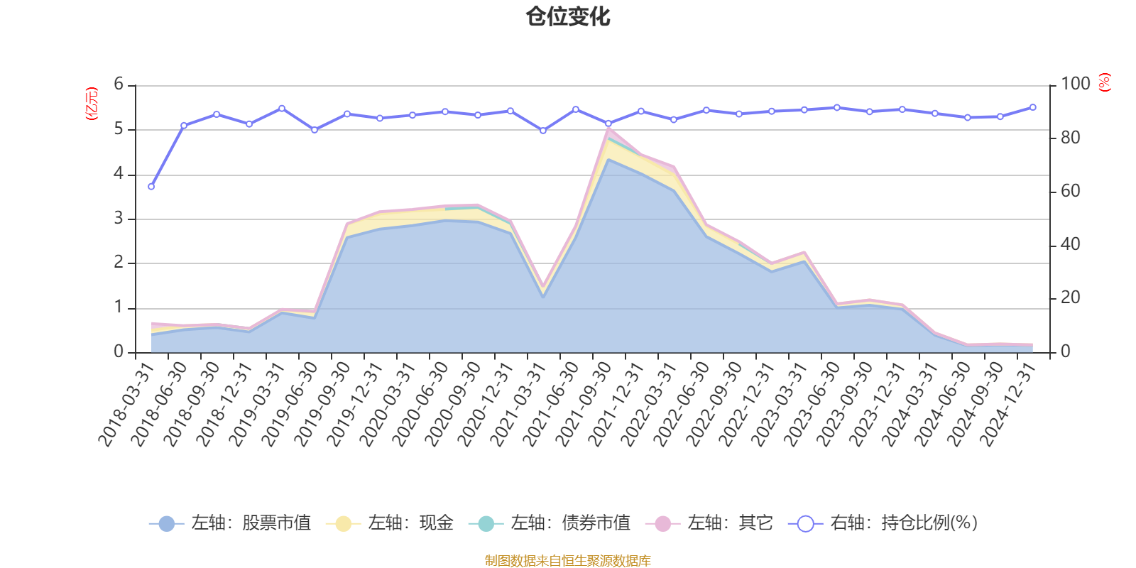 据定期报告数据统计,近三年平均股票仓位为89.85%,同类平均为83.34%。2024年末基金达到91.74%的最高仓位,2018年一季度末最低,为62.09%。